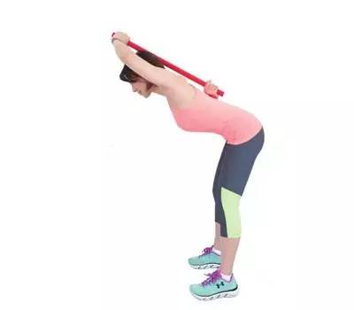 弯腰:手臂无法再上抬了以后,开始向前弯腰,记得背部要保持挺直,膝盖可微弯。