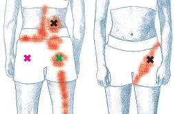 “X”符号表示触发点的位置,红色区域则表示可能出现不适的部位。其中髂腰肌用红色×表示,腰方肌用黑色×表示,梨状肌用绿色×表示。