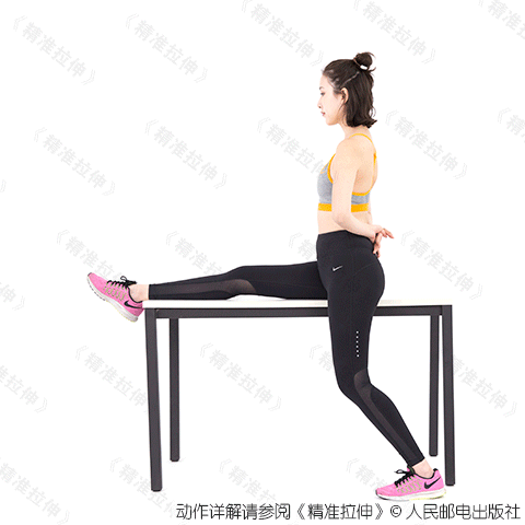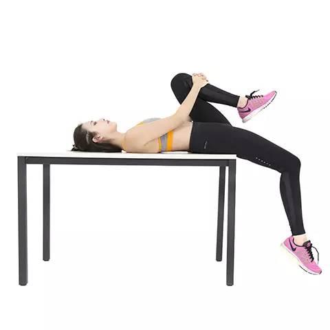 坐在一张稳固的桌子或长凳上。背部平躺在桌面上,双手朝胸腔方向拉起双腿。此时,整个腰背部应紧贴于平面。双手抓住左膝,小心地伸直右腿直至右腿自然悬空。