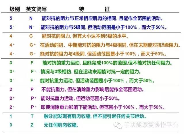 1983年,美国医学研究委员会在Lovett的MMT徒手肌力测定基础上进一步分细,对于被测肌力比某级稍强或稍弱时,以“+”和“-”来表示,这弥补了MMT的分级不足。(详见下表)此外,若检查时有痉挛加“S”或“SS”,有挛缩加“C”或“CC”,以表示该肢体有特殊情况。