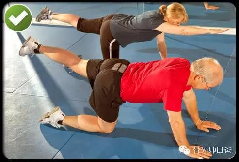 推荐运动5:Bird Dog 如图所示趴在运动垫上,一只脚向后伸,保持5s,换另外一只脚,重复8-12次。可以尝试增加后伸腿的时间。也可以在向后伸腿的同时将对侧的胳膊向前伸。在做这个动作时不要移动后腰的位置。