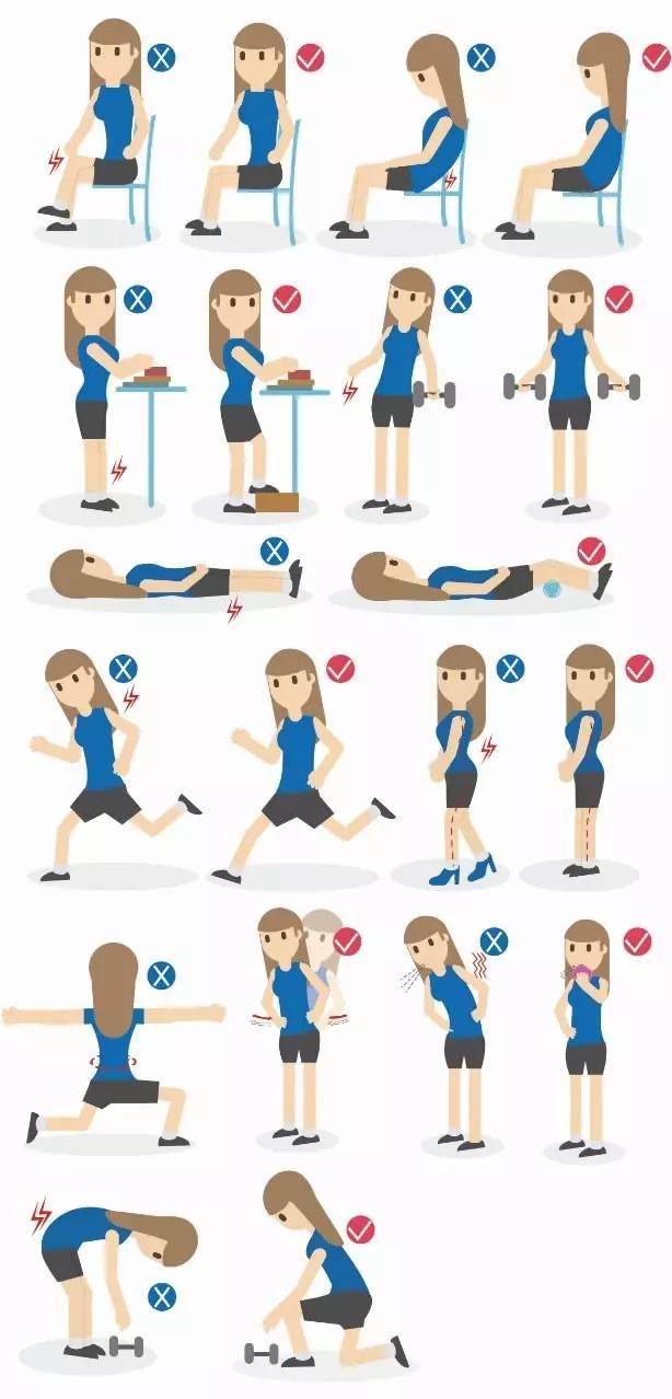 小贴士:坐着的时候保持上身挺直,收腹,下肢并拢。如坐在有靠背的椅子上,则应在上述姿势的基础上尽量将腰背紧贴椅背,这样腰骶部的肌肉不会太疲劳。