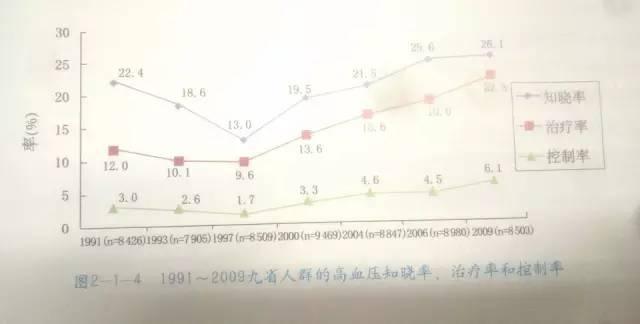 高血压的知晓率、治疗率、控制率 1991~2009年间中国营养与健康研究(CHNS)在九省进行的7次横断面调查显示,高血压的知晓率、治疗率、控制率呈上升趋势,但依旧处于较低水平。