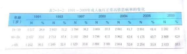 血压正常高值的患病率 1991~2009年间中国营养与健康研究(CHNS)在九省分别于1991、1993、1997、2000、2004、2006和2009年对18岁及以上成人进行了7次横断面调查,结果显示,血压正常高值的患病率从1991年的29.4%增加到2009年的38.7%,呈明显上升趋势。