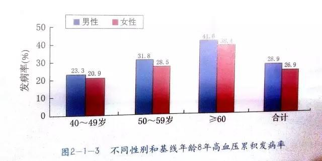 《中国居民营养与慢性病状况报告 2015》发布资料显示,2012年中国18岁以上成人高血压患病率为25.2%。根据2010年第六次全国人口普查数据,测算中国高血压患者为2.7亿。 高血压发病率 有研究对10525名40岁以上非高血压者从1991~2000年进行了平均8.2年的随访,28.9%的男性和26.9%的女性发展为高血压。