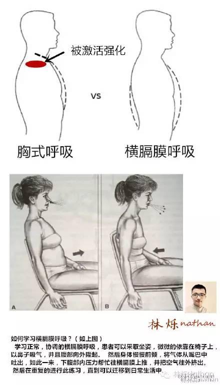 如何进行横膈膜呼吸?请看下图。而有部分人在实验了横膈膜呼吸之后,会发觉肚子变小了。这可能跟激活了让腹部缩小的肌肉有关。