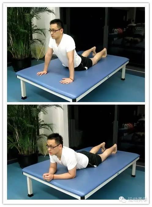 图片二(简化版):双肘支撑在床面上,背后伸,30秒X3组