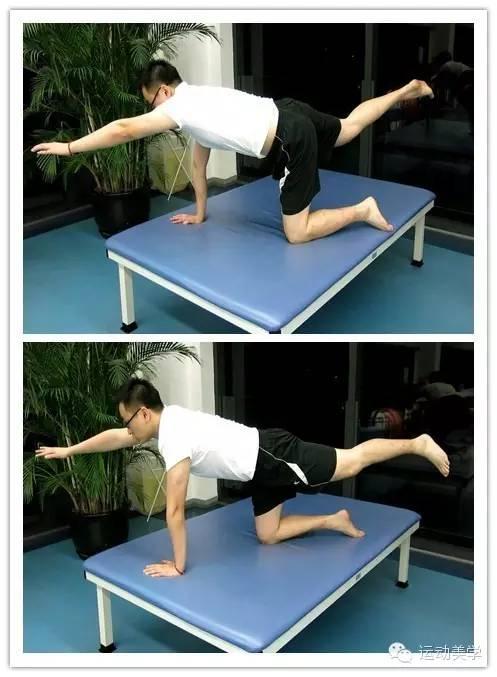 图片五:对侧手和腿向前和向后打开,保持1秒再慢慢放下,10个X3组